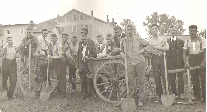 ![]() Die Fußballer des VfB Oberweimar beim Bau des Sportplatzes "Ilmgarten", der 1938 gegenüber der Elektrotechnischen Fabrik J. Carl (später VEB Elektoinstallation Oberweimar) errichtet wurde. |