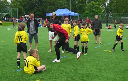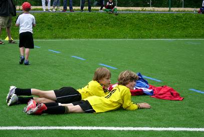 Endlich Sommer, werden sich einige gedacht haben... bis auf die Fußballer, denn es waren bereits 20 °C auf dem Thermometer, als wir uns zum letzten Saisonspiel der Rabauken vom VfB Oberweimar I. trafen. Manch einer hing ganz schön durch an diesem Morgen, denn die Sonne brannte auf den Parksportplatz. Bis auf Anton und Leon waren alle an Bord und jeder wollte spielen. Nachdem wir im Hinspiel recht viel Pech gehabt, die letzten fünf Spiele mit einer Serie von 15 Punkten und 28:7 Toren absolviert und darunter zwei Siege gegen die beiden Staffelprimusse eingefahren hatten, wollten wir uns natürlich auf heimischen Boden gegen den Staffeldritten nicht den Lauf vermiesen lassen. Aber Fußball hat manchmal keine Logik und so beendeten wir diese Saison leider mit einer Niederlage. Zunächst war es ein offener Schlagabtausch. Beide Teams kamen in regelmäßigen Intervallen zu Torraumszenen, wobei beim Abschluss die Kaltschnäuzigkeit und vielleicht auch ein wenig Glück fehlte. Im Kader von Legefeld gab es drei Riesenkerle, die noch dazu schnell und kräftig waren und wo uns in den entscheidenden Momenten der eine Schritt oder der Energieschub gefehlt hat. Auffällig waren die Fehler in der Verteidigung von unseren sonst so sicheren Akteuren, vielleicht auch, weil mit Richie der Ruhepol nicht da war. Doch der ging ins Tor, da man gegen Legefeld vor allem die Distanzschüsse der großen Kinder fürchten musste. Deswegen kann ich als Torhüter ihm beim 0:1 absolut keine Vorwürfe machen (nach einer Ecke rutschte ihm der glitschige Ball durch die Hände, noch dazu blickte er direkt in die Sonne). Sehr unglücklich, aber das Spiel hatte ja gerade erst begonnen. Solche Situationen zeigen immer den Charakter und den Fortschritt des Teamgefüges einer Mannschaft, wenn sie nun geschlossen hinter ihrem Rückhalt stehen und sich nicht aus dem Konzept bringen lassen. Unser Teamgefüge war nicht perfekt, aber auch alles andere als schlecht. Julius kam in der 2. Hälfte herein und ersetze unseren kleinen Leo, dem die Hitze sehr zu schaffen machte. Das wir spielen können, haben wir oft genug bewiesen und das es dazu noch super aussehen kann, bewies der Eingewechselte: nach einem langen Pass von Arvid in die Spitze auf den mit dem Rücken zum Tor stehenden Julius konnte der mit einem traumhaften Hackenkick den Ball im Tor unterbringen. Einen besseren Beweis für das Kreativitätspotential unserer Truppe gibt es nicht, denn solche Tore sind eher selten in einer E – Junioren Kreisklasse. Doch diesmal konnten wir uns nicht lange freuen. Legefeld arbeitete einfach mehr und schaltete schneller vom Verteidigen auf Angriff um. Wir ließen zu viel freien Raum auf der Außenbahn liegen und konzentrierten uns auf das Spiel durch die Mitte; da war aber kein Platz. Unsere beiden Außenspieler zogen oft nach innen und so wurde das Spiel noch enger, auch wenn sie damit die Vorgabe der Trainer erfüllt haben. Noch etwas war nicht akzeptabel: Legefeld spielte mit einer Spitze und schaffte es gegen zwei Verteidiger mit drei Kind Überzahl zu kontern – damit begingen wir denselben Fehler wie im Hinspiel. Sie hatten aber auch einen schnellen Stürmer, der dazu noch ein gutes Repertoire an Körpertäuschungen bereithielt, doch wir fanden kein Mittel ihn zu stoppen. Letzthin stand es 1:4 und Leo konnte mit einem schönen Linksschuss noch auf 2:4 verkürzen, nachdem er nochmals eingewechselt wurde. Wir ließen auch wieder einige Chancen sträflich aus, doch der Gegner hatte auch einige, die Richie vereitelte. Am Ende können wir sagen, dass der Zwei – Tore Unterschied und der Sieg für den SV Einheit absolut in Ordnung geht.