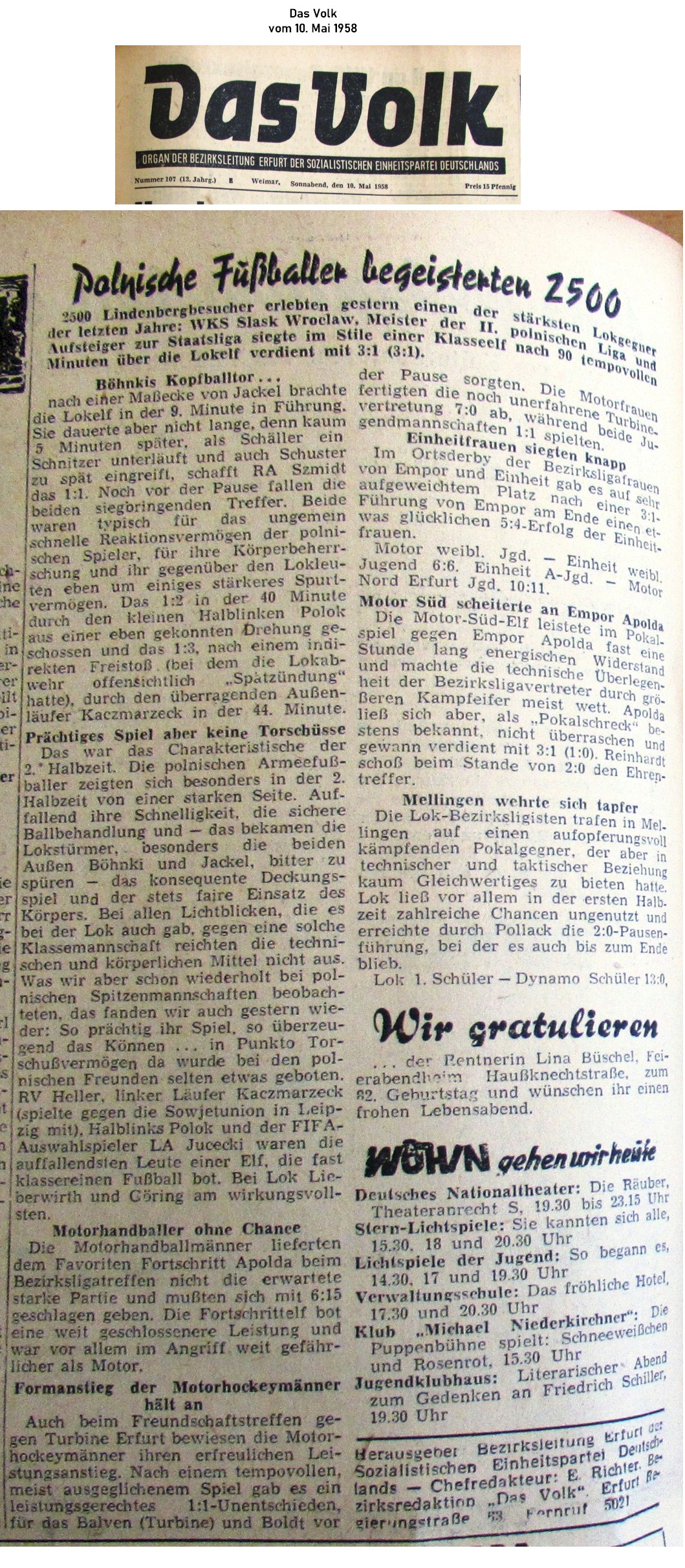 Unsere Pressearchiv: Motor Süd scheiterte an Empor Apolda (Das Volk 10.05.1958)