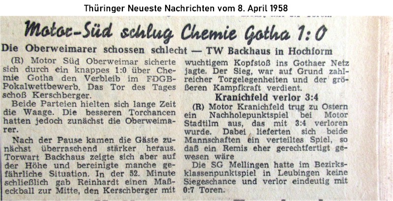 Unsere Pressearchiv: Motor Süd schlug Chemie Gotha 1:0 (Thüringer Neueste Nachrichten 08.04.1958)