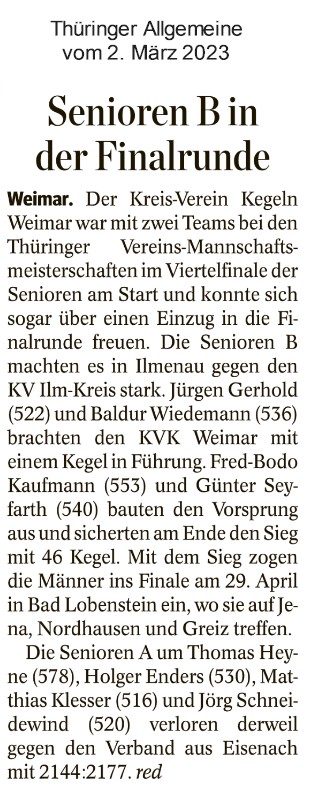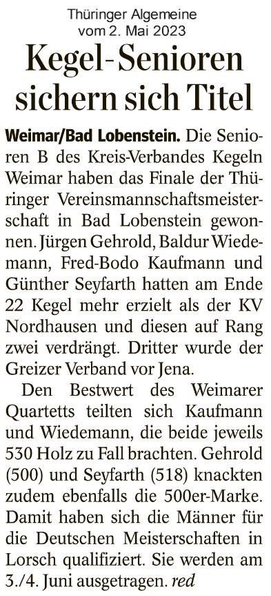 Senioren B des Kreis-Verein Kegeln Weimar sind Thüringer Meister30.04.2023 Am 29.4.23 fand in Lobenstein das Finale der Thüringer